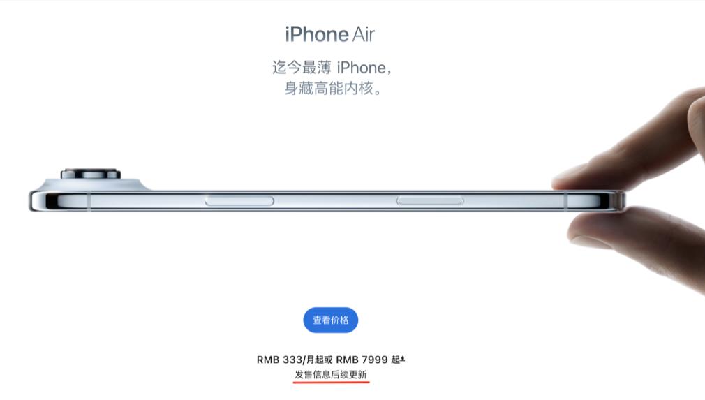 iPhone Air起價(jià)7999元,憑借5.6mm的厚度、165g的重量,成為蘋(píng)果史上最薄機(jī)型,機(jī)身采用鈦金屬邊框與超瓷晶玻璃。