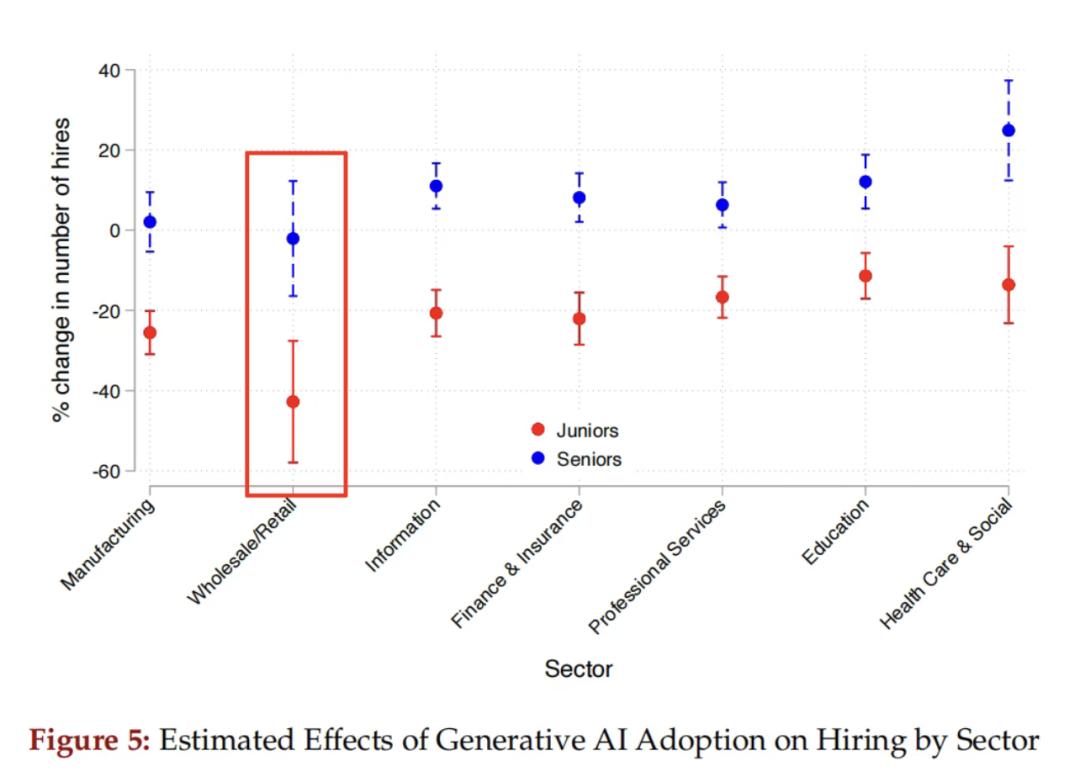 這一現(xiàn)象并非個別行業(yè)的問題,幾乎所有行業(yè)都受到影響,程度有所不同?;ヂ?lián)網(wǎng)、軟件、設(shè)計等行業(yè)受沖擊較大,但批發(fā)零售業(yè)受影響最嚴重。該行業(yè)的初級崗位,如文員、客服、導購,容易被AI替代。擁抱AI的零售公司比未使用AI的同行每季度少招40%的新人,招聘量減半。