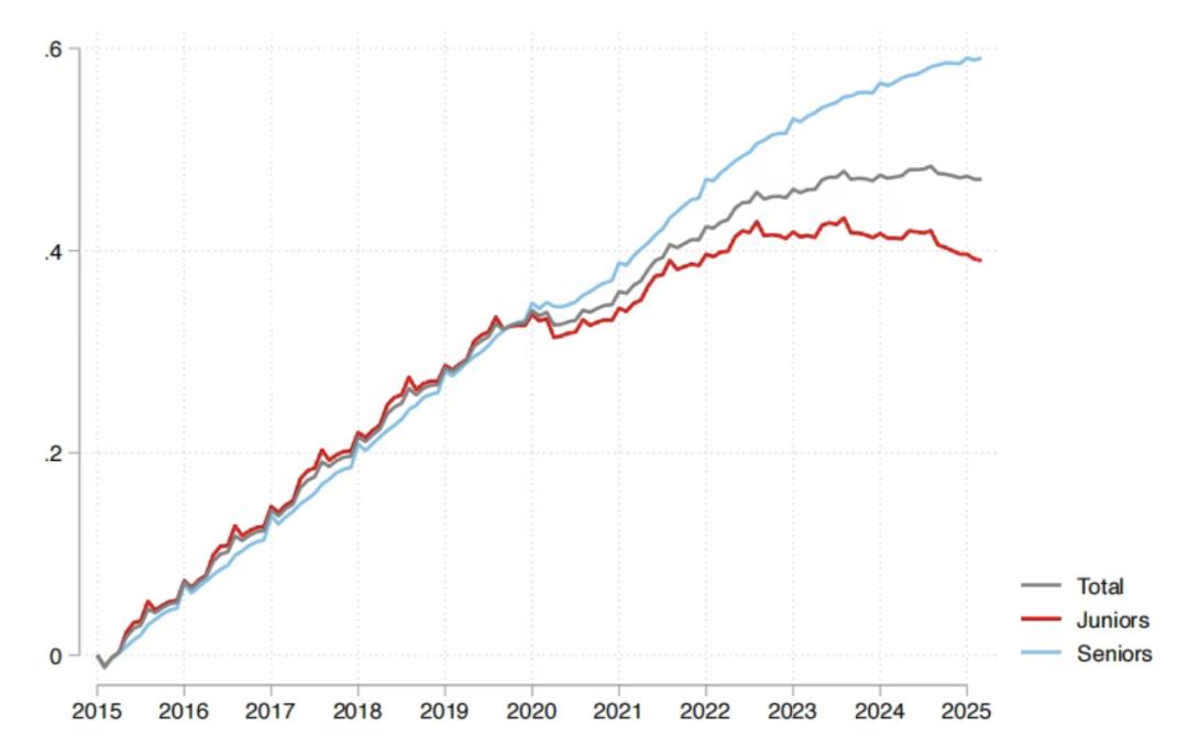 測試結(jié)果顯示,2023年第一季度起,使用AI的公司初級崗位招聘數(shù)量明顯下降,與對照組差距逐漸擴大,六個季度后相差7.7%。而高級崗位不受影響,AI公司甚至更積極招聘高級人才。這表明擁抱AI的公司減少了初級崗位招聘,AI正在“卡死”初級崗位。