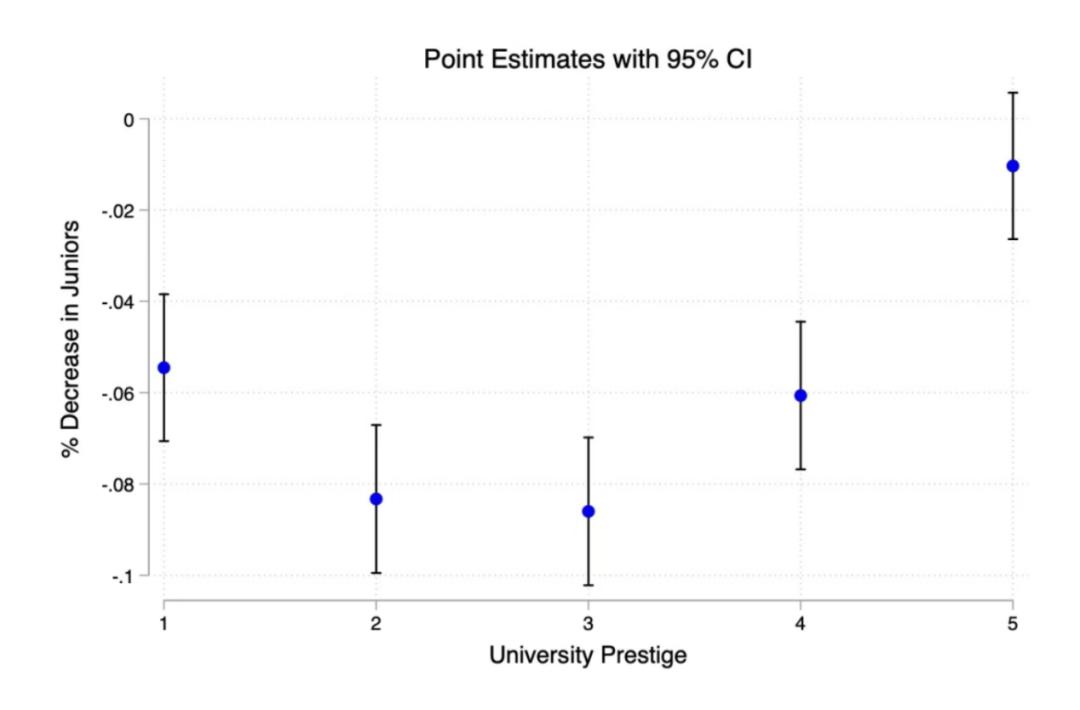 更令人沮喪的是,名校學歷也無法保障就業(yè)。研究將畢業(yè)院校分為Tier 1到Tier 5五個檔次,結(jié)果呈“U型曲線”。頂尖名校(Tier 1)畢業(yè)生受影響較小,普通地方學校(Tier 5)畢業(yè)生也尚可,受打擊最大的是Tier 2和Tier 3學校的畢業(yè)生。原因是頂尖名校生能解決復雜問題,不易被AI替代;普通學校畢業(yè)生成本低、性價比高;而中間檔畢業(yè)生薪資要求不低,工作內(nèi)容又易被AI替代,處于尷尬境地。
