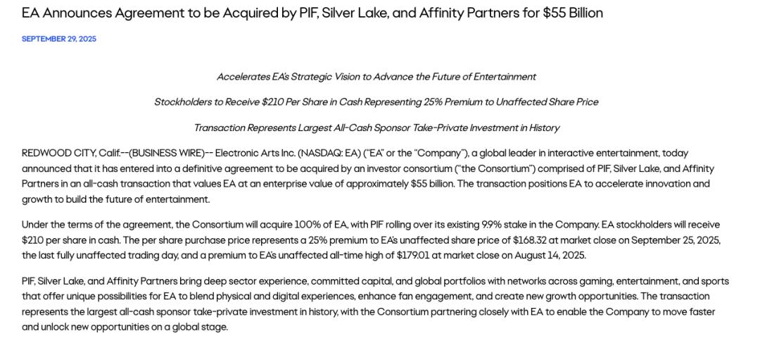 公告稱這是“史上規(guī)模最大的全現(xiàn)金私有化收購(gòu)交易”,藝電股東將獲得每股210美元的現(xiàn)金對(duì)價(jià)。與收購(gòu)傳聞出現(xiàn)前的最后一個(gè)交易日(9月25日)收盤(pán)價(jià)相比,溢價(jià)達(dá)到25%。