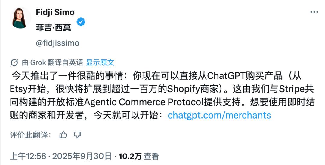 “我們希望讓用戶在ChatGPT中完成整個購物旅程更輕松,同時也讓商家和開發(fā)者能把這些對話直接轉(zhuǎn)化為訂單?!?/p>