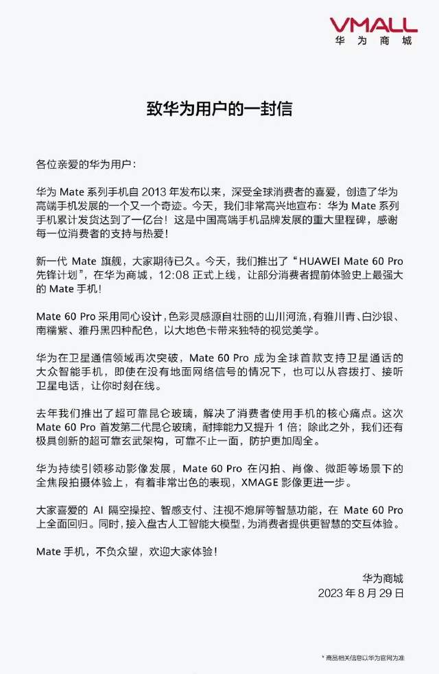 2023年8月29日,華為商城發(fā)布《致華為用戶的一封信》,宣布Mate 60 Pro將在該日12:08上線,“讓部分消費(fèi)者提前體驗(yàn)史上最強(qiáng)大的Mate手機(jī)”