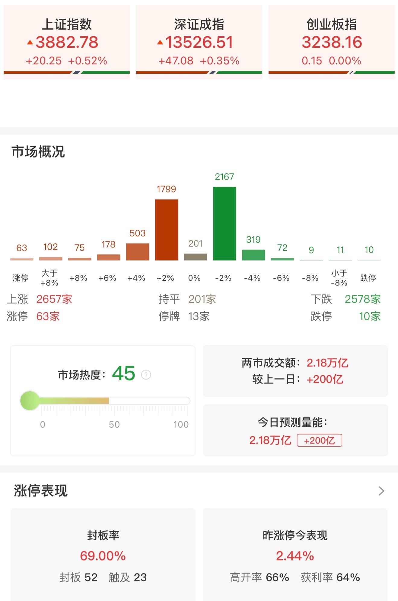 今日盤面方面,滬深兩市成交額達(dá)2.18萬億,相較于上一交易日放量200億。截至收盤,滬指上漲0.52%,深成指上漲0.35%,創(chuàng)業(yè)板指漲幅為0.00%。