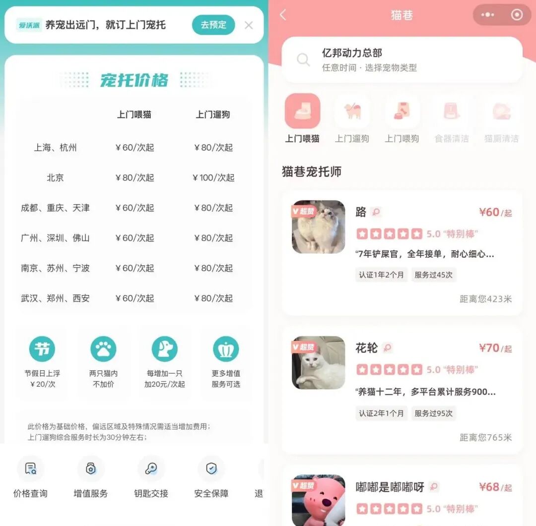 每年國慶和春節(jié),是這些寵物上門服務(wù)平臺的生意旺季,往往占到全年生意的60%以上。今年國慶期間,寵物服務(wù)平臺愛沃派平臺下單,市內(nèi)和市郊地區(qū)每次上門喂養(yǎng)服務(wù)會增加20元,偏遠地區(qū)訂單上浮40元,總價大概60 - 100元,遛狗、洗澡、剃毛、驅(qū)蟲等需要額外收費。貓巷平臺上,國慶上門喂貓費用大概在40 - 80元,喂狗和遛狗服務(wù)大概60 - 100元,不同寵托師上門服務(wù)價格不一樣。