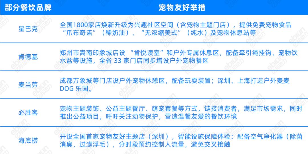 今年,海底撈全國首家寵物友好主題店在深圳試營業(yè),肯德基首家 “寵物友好” 餐廳在河南鄭州開門迎客,同步全省33家門店均增設(shè)寵物友好戶外餐區(qū)。必勝客也在北京、上海等四城設(shè)寵物友好主題店,提供外擺專區(qū)。
