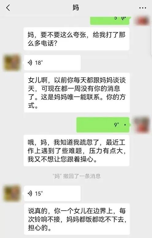 在手機(jī)上聽完留言,駱超然趕緊給媽媽發(fā)去語音:“媽,要不要這么夸張,給我打了那么多電話?”她馬上就收到了媽媽的回復(fù):“女兒啊,以前你每天都跟媽媽談?wù)勌欤涩F(xiàn)在都一周沒有你的消息了”。