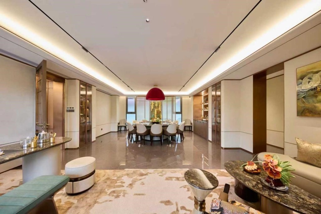 其內(nèi)部以“隱奢、秩序、質(zhì)感”為設(shè)計(jì)核心,將高級(jí)審美與人性化考量融入每一寸空間。整體采用低飽和度中性色調(diào),搭配金屬質(zhì)感點(diǎn)綴,構(gòu)建出沉穩(wěn)而富有張力的視覺層次,光線通過漫反射柔和地鋪陳開來,營造出靜謐而包容的氛圍。