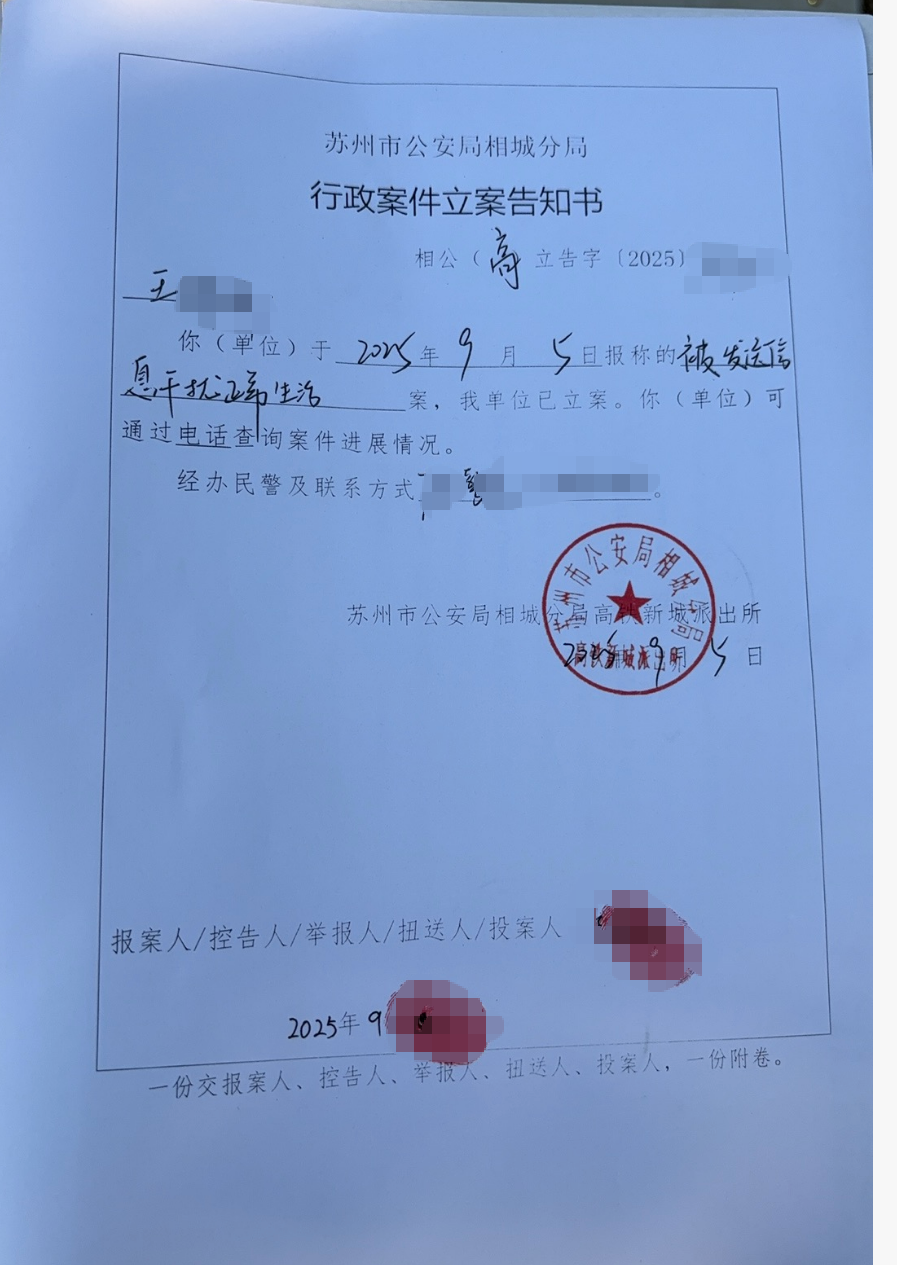 9月5日,蘇州市公安局相城分局高鐵新城派出所已對王女士報稱的“被發(fā)送信息干擾正常生活”一案進(jìn)行立案。