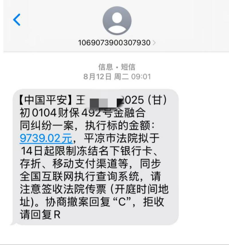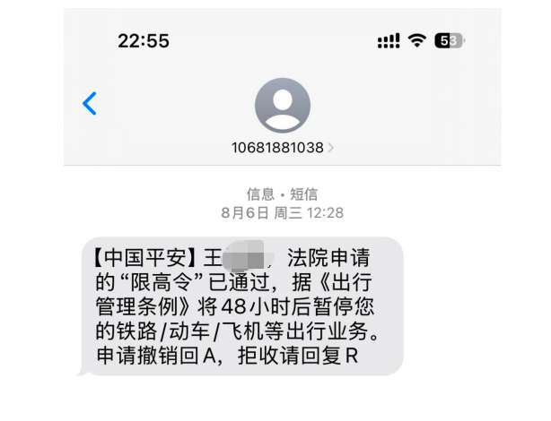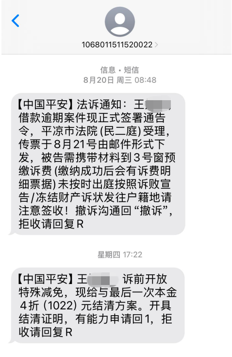 王女士介紹,自今年6月起,她陸續(xù)收到陌生手機(jī)號發(fā)送的騷擾短信,對方聲稱她仍有“平安融易”的借款未還。王女士起初以為只是普通詐騙短信,并未在意。直到8月份,她名下5個手機(jī)號,又陸續(xù)收到106開頭的帶有“中國平安”抬頭的催收短信,其中還夾帶“平?jīng)鍪蟹ㄔ骸钡牧缸痔柡烷_庭信息。短信內(nèi)容還包括:“【中國平安】王**,法院申請的‘限高令’已通過,據(jù)《出行管理?xiàng)l例》將 48小時后暫停您的鐵路/動車/飛機(jī)等出行業(yè)務(wù)。”