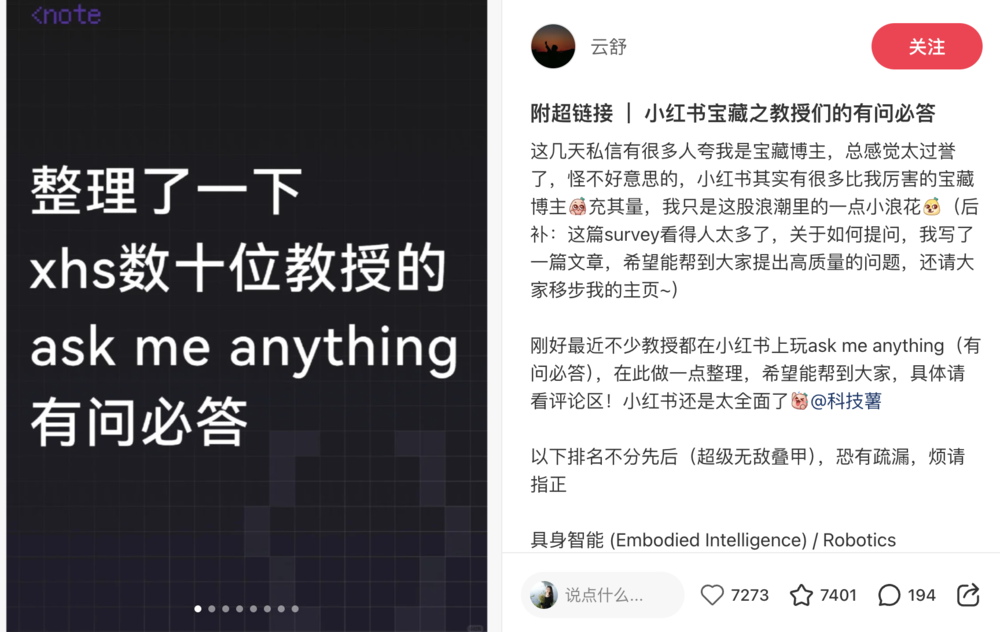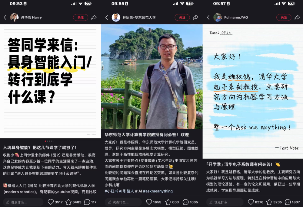 虎嗅梳理發(fā)現(xiàn),這輪 AMA 趨勢風(fēng)靡分兩個(gè)階段。第一階段,運(yùn)營總結(jié)出 AMA 范式。在“AI 引路人”活動(dòng)中,多位高校學(xué)者、專家發(fā)布 AMA 筆記,如清華大學(xué)許華哲、華東師范大學(xué)林紹輝等。他們的筆記引發(fā)大量關(guān)注,與用戶積極互動(dòng),話題多次登上熱榜。