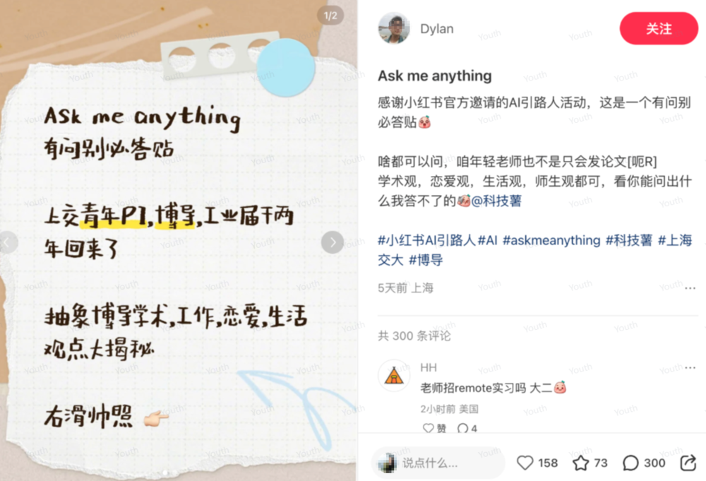 虎嗅發(fā)現(xiàn),近期,Ask me anything(簡稱 AMA)玩法在小紅書成為熱議“新風(fēng)潮”。眾多 AI 學(xué)術(shù)圈大佬、知名 AI 創(chuàng)業(yè)者、大模型負(fù)責(zé)人紛紛在小紅書發(fā)起“Ask me anything”筆記,邀請用戶不設(shè)限提問,并積極在評論區(qū)互動(dòng)交流。
