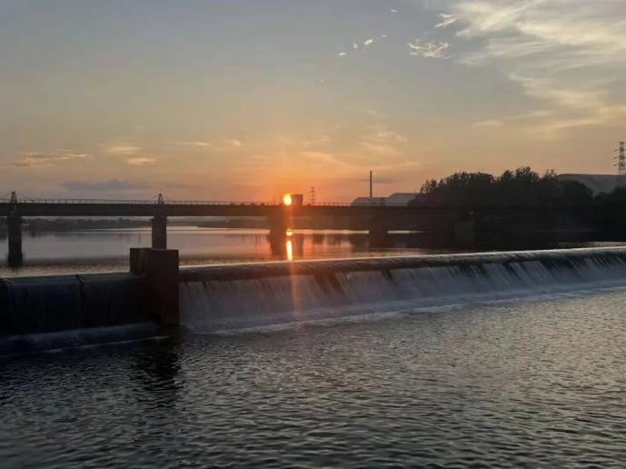 河面上凸起的石塊,袁河水從劉家壩像瀑布一樣流下,波光粼粼。傍晚,晚霞在不同水面上呈現(xiàn),橙紅色布滿天空,讓人陶醉其中。