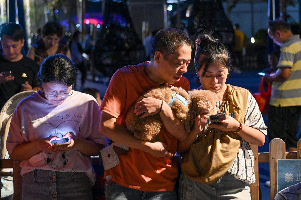 市民帶著小狗,等候觀看煙花秀。澎湃新聞記者 朱偉輝 圖
