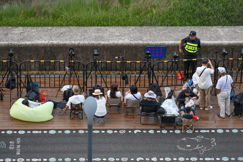 不少攝影愛好者早早占據(jù)有利位置,架好設(shè)備,坐在自帶凳子上,甚至還有自帶充氣沙發(fā)的市民。澎湃新聞記者 朱偉輝 圖