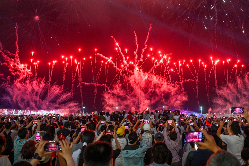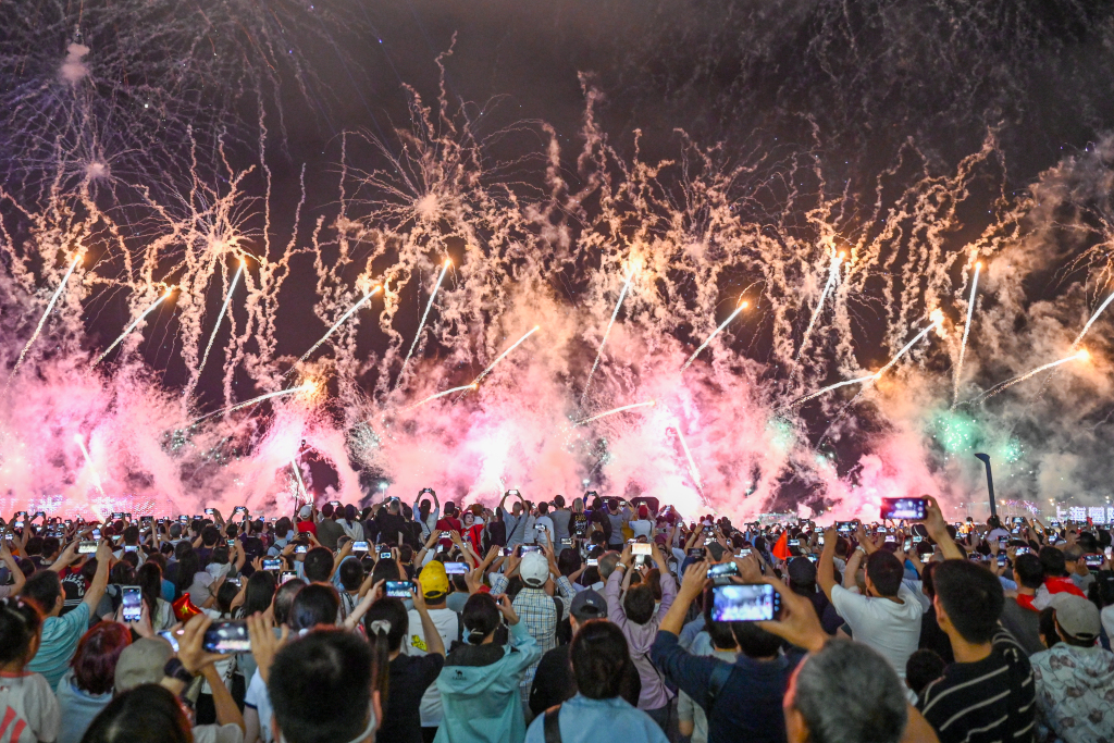 2025年9月30日,上海吳淞口國際郵輪港,市民游客在拍攝煙花秀。澎湃新聞記者 朱偉輝 圖