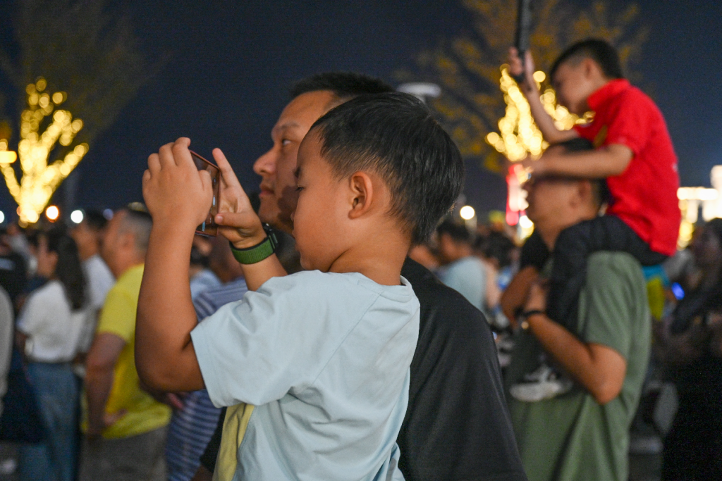 小朋友坐在家長肩膀上拍攝煙花秀。澎湃新聞記者 朱偉輝 圖