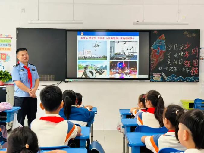 ▲國(guó)慶前夕,全國(guó)先進(jìn)工作者、全國(guó)公安系統(tǒng)二級(jí)英雄模范、合肥市公安局特巡警支隊(duì)副支隊(duì)長(zhǎng)王軍走進(jìn)蚌埠路第二小學(xué),為孩子帶來一堂生動(dòng)的愛國(guó)教育課。