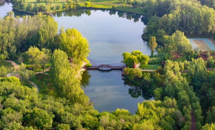 山西省臨汾市汾河文化生態(tài)景區(qū)內(nèi),水清岸綠,秋色漸濃,小橋樓閣、濕地湖泊與多彩植物相互輝映。李現(xiàn)俊 攝影