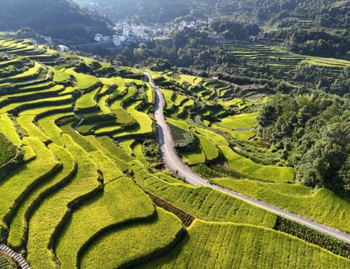 浙江省樂清市白石街道中雁村的山間梯田水稻泛黃,豐收在即,層層稻田鑲嵌在黛色山腰,與村居、山景相互映襯,宛如田園詩。蔡寬元 攝影