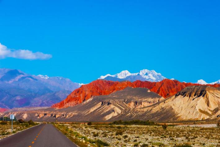 新疆維吾爾自治區(qū)阿克蘇地區(qū),天山托木爾景區(qū)的山體在藍(lán)天白云下色彩絢麗,有紅、黃、紫等顏色,遠(yuǎn)處雪山的映襯和蜿蜒的公路,勾勒出雄渾的自然風(fēng)光。王舉南 攝影