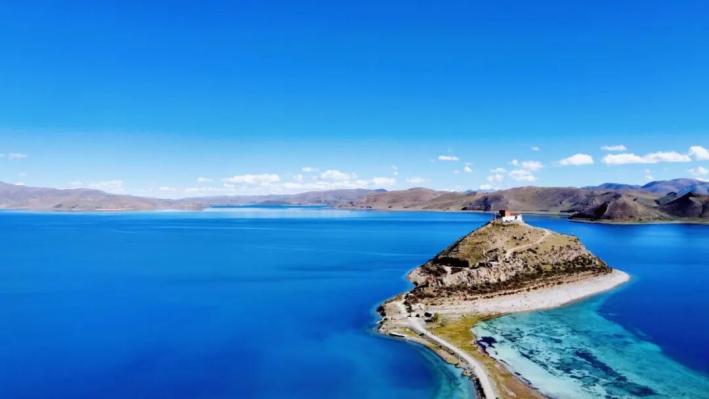 西藏自治區(qū)山南市的羊卓雍措與遠(yuǎn)處天空融為一體,形成漸變藍(lán)色,只有幾朵飄動(dòng)的云絮點(diǎn)綴其中。洛松卓瑪 攝影