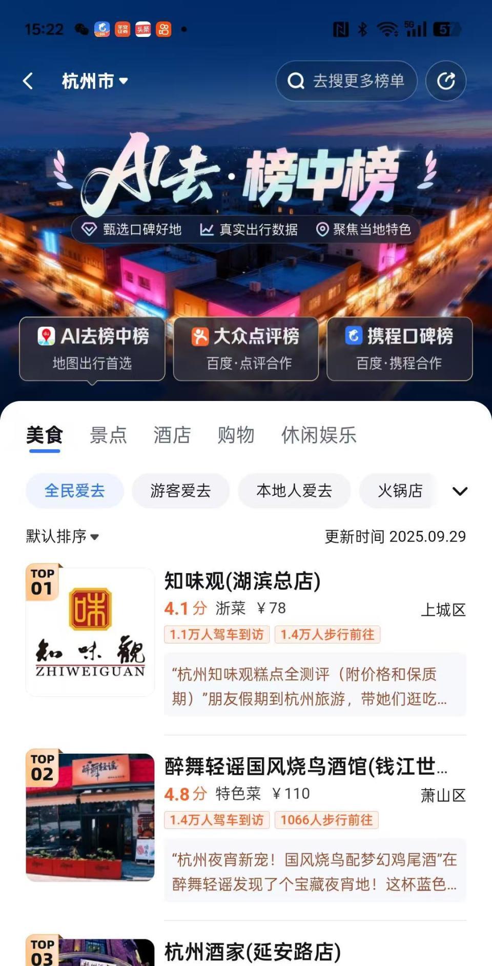 打開頁面,能清晰看到三個榜單:AI去榜中榜、大眾點評榜(百度·點評合作)、攜程口碑榜(百度·攜程合作),形成了橫跨地圖、本地服務、OTA 的聯(lián)盟。