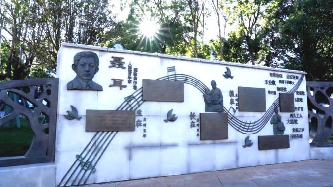 聶耳雕塑一側(cè)是“聶耳與國歌”主題文化墻,左側(cè)以五線譜為弦貫穿始終,右側(cè)為國歌的誕生背景,二者共同奏響聶耳與國歌的不朽樂章。