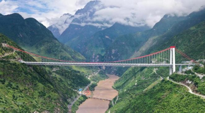 跨徑峽谷懸索橋路段:金安金沙江大橋東起石格拉2號(hào)隧道,上跨金沙江水道,西接金安隧道至金安互通,主橋長(zhǎng)1632米,主跨長(zhǎng)1386米,海拔為1780米。