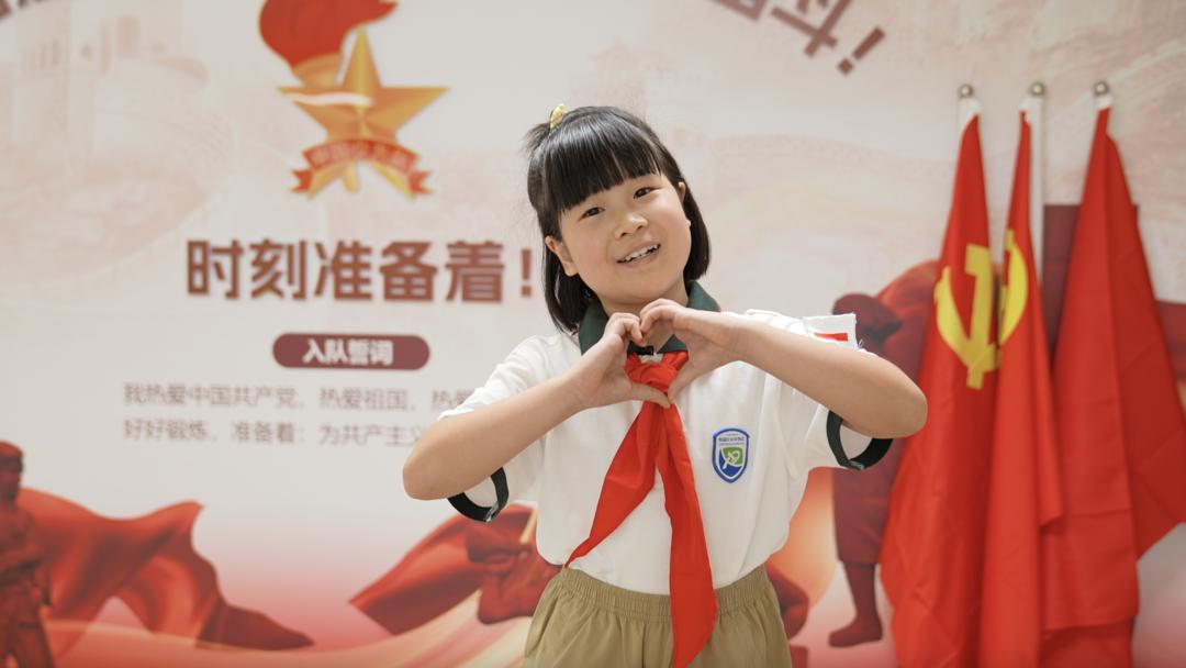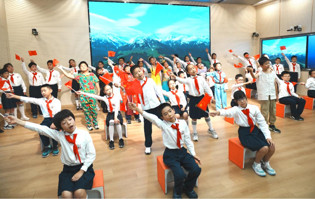 新普陀小學(xué)東校的學(xué)生們揮舞著手中的五星紅旗,用清澈響亮的童聲傳遞著對(duì)祖國(guó)真摯的祝福。