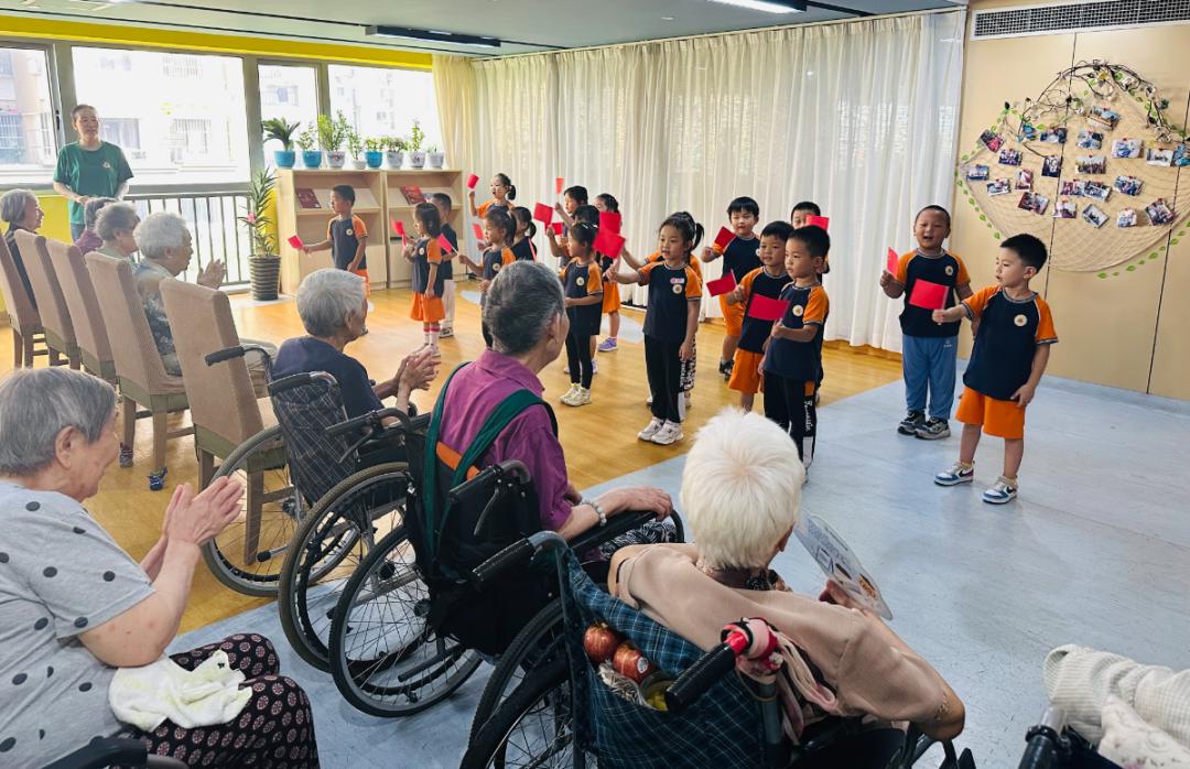 楊家橋幼兒園的孩子們走進(jìn)隔壁的社區(qū)敬老院,向爺爺奶奶們送上節(jié)日的祝福。