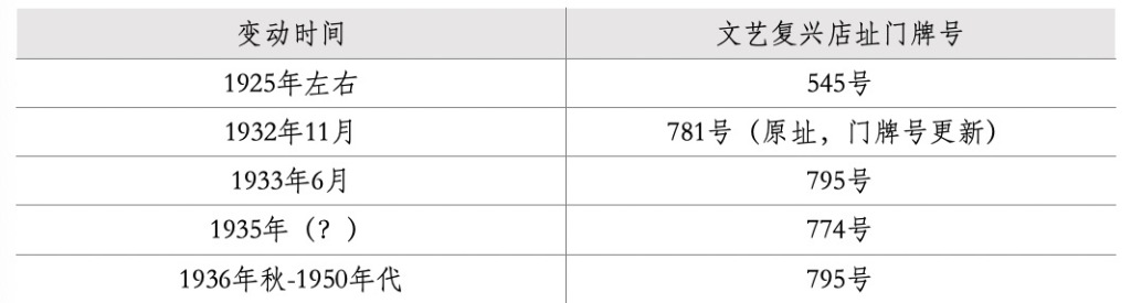 1933年6月,報(bào)社搬到馬路對(duì)面的774號(hào)。推測(cè)文藝復(fù)興此時(shí)搬到795號(hào)。霞飛路東西走向,門(mén)牌號(hào)碼北側(cè)為雙數(shù),南側(cè)為單數(shù),自東向西走,文藝復(fù)興在街道左邊,符合1930年代人對(duì)其位置的印象。不久,因795號(hào)翻修,文藝復(fù)興搬到對(duì)面774號(hào)和《柴拉報(bào)》共用店址。1936年秋工程結(jié)束,搬回795號(hào),此后未再搬遷,這或許是大家公認(rèn)其地址為795號(hào)的原因。1936年11月短文回顧其歷史,提到1925年開(kāi)設(shè),原在金神父路(今瑞金二路)口,不久遷到對(duì)面《柴拉報(bào)》處,最近遷回,簡(jiǎn)化了變遷過(guò)程。過(guò)程總結(jié)如下: