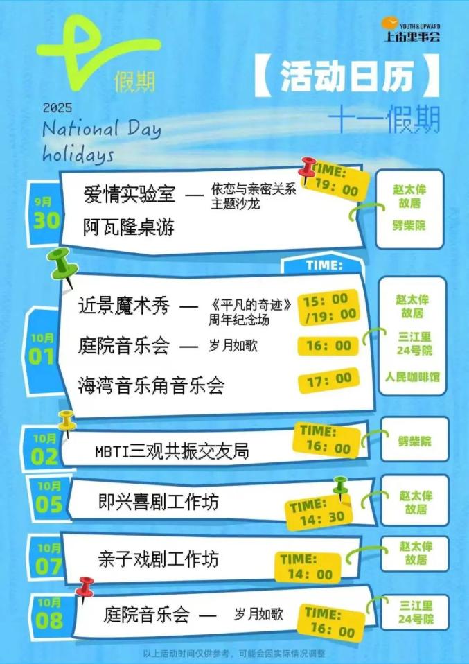 喜劇愛(ài)好者在這個(gè)假期能盡情歡笑。10月4日下午,本土喜劇廠牌“青島一支麥喜劇”將在劈柴院社群空間二樓帶來(lái)脫口秀表演;10月5日下午和7日下午,趙太侔故居將分別上演糖豆喜劇的即興喜劇和親子戲劇,滿足不同年齡段觀眾的笑點(diǎn)需求,為節(jié)日增添歡樂(lè)氛圍。