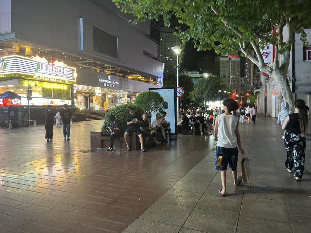 23時(shí)許,南京路步行街西面大多沿街商鋪已打烊,游客在街心長椅歇腳。