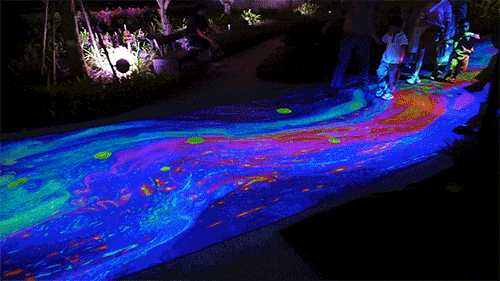 在“水之詩(shī)”的園路,設(shè)置了彩虹投影,還配備了先進(jìn)的人體追蹤設(shè)備。當(dāng)行人經(jīng)過(guò)時(shí),地面會(huì)投射出以荷花蓮葉為元素的陣陣漣漪。