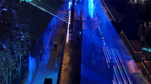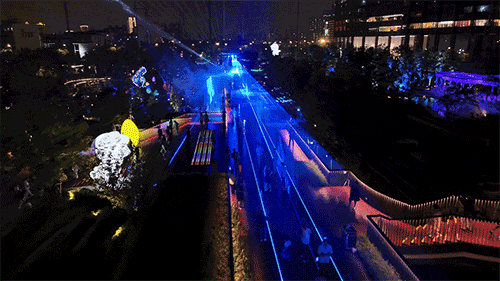 在“數(shù)之元”的棧橋之上,通過(guò)激光和煙霧,呈現(xiàn)出一條充滿未來(lái)感的科幻廊道,就像時(shí)空隧道一樣,將普陀區(qū)的悠久歷史與璀璨未來(lái)緊密相連。此外,公園內(nèi)還設(shè)有三處燈光秀,光影裝置會(huì)與人影互動(dòng),趣味十足,沉浸感滿滿。
