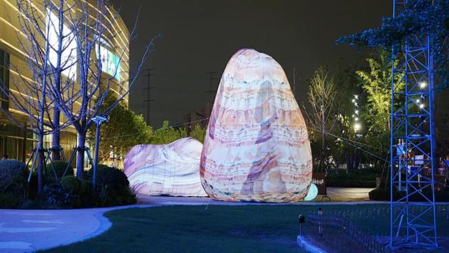 與海納公園一路之隔的上海真如環(huán)宇城MAX,商場(chǎng)內(nèi)布置了精美的光影裝置,如巖石云朵互動(dòng)氣模裝置“曠息”,沙漠巖石狀與云朵狀的氣膜裝置,將商場(chǎng)的戶外空間與建筑外立面進(jìn)行了詩(shī)意的聯(lián)結(jié)。