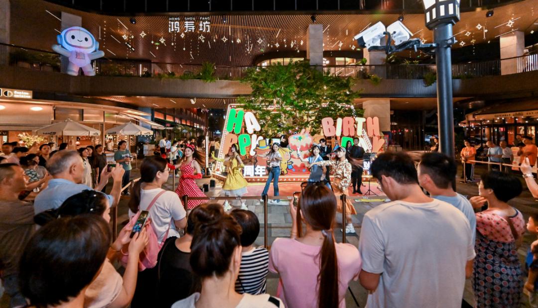 開(kāi)業(yè)2周年的鴻壽坊今年也成為普陀分會(huì)場(chǎng)點(diǎn)位之一,商場(chǎng)利用光影裝置打造海派美學(xué),“油條”造型的空中藝術(shù)裝置點(diǎn)亮主入口,喚起人們的美食記憶。國(guó)慶期間,鴻壽坊以“煙火劇場(chǎng)開(kāi)心季”為主題,打造“社區(qū)劇場(chǎng)”“煙火劇場(chǎng)”,帶來(lái)迷你戲劇嘉年華、烏鎮(zhèn)戲劇節(jié)同款劇目、木偶劇、光影泡泡秀、創(chuàng)意打擊樂(lè)秀、脫口秀、互動(dòng)魔術(shù)表演等形式多樣的演出。