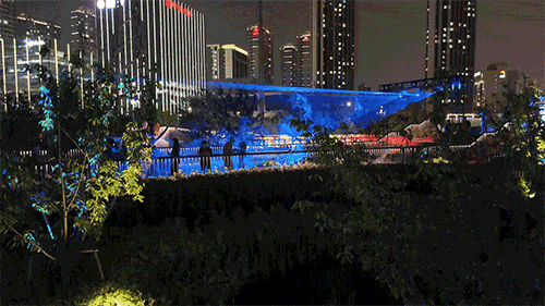 海納公園投入了10臺(tái)激光投影機(jī)、15臺(tái)激光表演機(jī)及格柵屏,打造出沉浸式體驗(yàn)空間。而且,光影設(shè)備均采用低能耗光源,延續(xù)了光影節(jié)“低碳辦展”的理念。