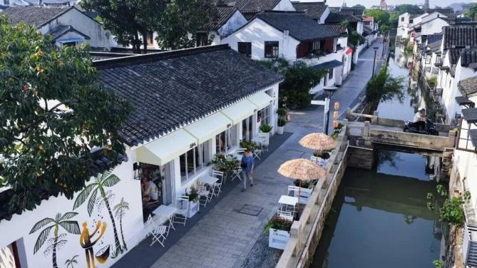 山前坊文創(chuàng)區(qū)是文藝青年的心頭好。瓦上咖啡館以奶白色建筑營造溫馨居家氛圍;勿界·派對空間以黑白灰為主色調(diào),搭配摩洛哥熱帶植物風格,提供咖啡、私房菜、小酒等多種選擇。