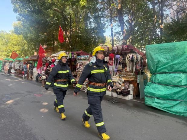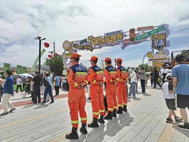 在世界魔鬼城、獨(dú)庫景區(qū),消防員在核心游覽區(qū)定點(diǎn)執(zhí)勤,沿觀光路線動態(tài)巡邏,實(shí)時排查用火隱患、疏導(dǎo)人流。
