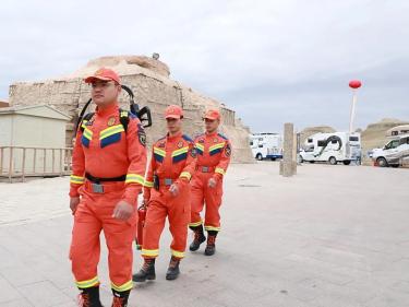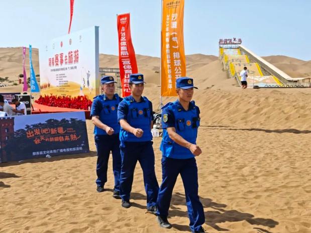 在庫木塔格沙漠景區(qū),消防員進(jìn)行巡邏與消防安全檢查,守護(hù)往來游客安全。