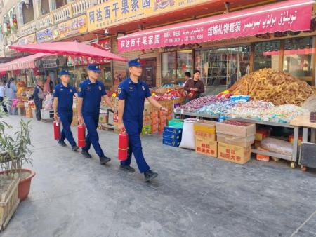 在喀什·古城巴扎,消防員穿梭于古城街巷,提醒商戶注意用火安全。