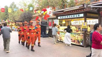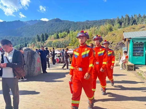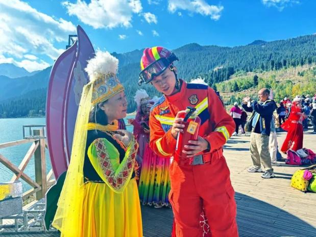 在天山天池景區(qū),醉人的秋色中,消防員的身影成為游客安心游覽的“定心丸”。
