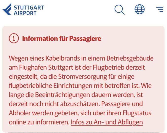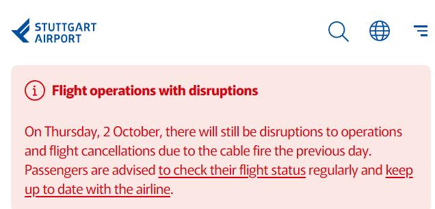 10月2日,斯圖加特機場再次發(fā)布公告,稱由于前一天電纜起火,機場運行仍受影響,仍有航班被取消。