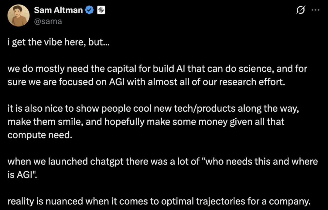 OpenAI是全球增長最快的消費(fèi)科技公司,也是一家有崇高非營利使命的前沿AI實(shí)驗(yàn)室。有些前OpenAI員工認(rèn)為,雖然它運(yùn)營消費(fèi)性業(yè)務(wù),但這些業(yè)務(wù)也能支持其使命,例如通過ChatGPT資助AI研究,并將技術(shù)廣泛傳播。奧特曼也在X上發(fā)帖解釋了公司為AI社交媒體應(yīng)用分配大量資金和計(jì)算能力的原因。