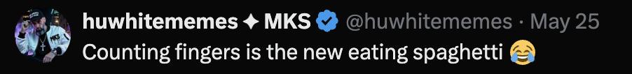此前史密斯吃意大利面是AI視頻生成模型的出圈測(cè)試案例,如今數(shù)手指成了新基準(zhǔn)。有人認(rèn)為視頻模型數(shù)不明白手指,或許是提示詞表述模糊。于是網(wǎng)友給出更具體的提示詞:“a man considers each digit(finger) of both of his hands as representing a number, starting from his right hand thumb as representing "one" and the pinky of his left hand as "ten", he begins at the beginning, on the digit (finger) representing "one' and systematically and meticulously advances through the counting out loud as he raises and display each digit (finger) that corresponds with his verbal and logical count.(一個(gè)人將雙手的每個(gè)手指視為一個(gè)數(shù)字,從右手拇指代表「1」,左手小指代表「10」開始,從代表「1」的數(shù)字開始,系統(tǒng)而細(xì)致地大聲數(shù)數(shù),同時(shí)舉起并展示與他的口頭和邏輯計(jì)數(shù)相對(duì)應(yīng)的每個(gè)數(shù)字)”。然而用這個(gè)新提示詞分別測(cè)試Sora2和Veo3,還是失敗了。
