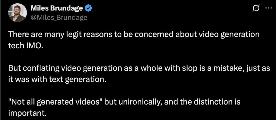 人工智能政策研究員Miles Brundage認(rèn)為,“有很多合理的理由讓我們擔(dān)心視頻生成技術(shù),但是將視頻生成與整體混為一談是一個(gè)錯(cuò)誤?!?/p>