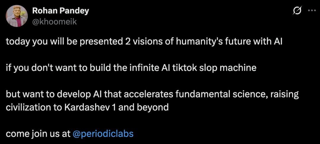 前OpenAI研究員Rohan Pandey借此機(jī)會(huì)宣傳了他的新創(chuàng)公司Periodic Labs,他說:“如果你不想建造一個(gè)無休止的AI TikTok垃圾機(jī)器,而是希望開發(fā)加速基礎(chǔ)科學(xué)的AI……來加入我們,加入Periodic Labs。”