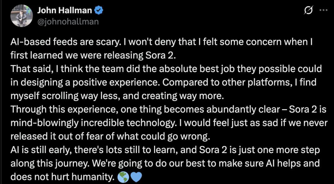 OpenAI預(yù)訓(xùn)練研究員John Hallman表示:“基于AI的動(dòng)態(tài)很可怕。不可否認(rèn),當(dāng)我第一次得知我們要發(fā)布Sora 2時(shí),我感到有些擔(dān)憂。不過,我認(rèn)為團(tuán)隊(duì)在設(shè)計(jì)一個(gè)積極的體驗(yàn)方面已經(jīng)盡力而為……我們會(huì)盡最大努力確保AI幫助人類,而不是傷害人類?!?/p>
